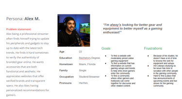 Based on my observations, I noticed some trends among my participants. They showed an interest in purchasing new merchandise, yet many felt uneasy about the authenticity of branded items available online. A major concern was that numerous websites lacked detailed product descriptions, which would assist in determining compatibility with newer hardware. Furthermore, my research revealed that products featuring verified-brand partnerships and “official partner” tags instilled a sense of confidence and trust among users. This insight inspired me to create a persona named Alex Martinez.