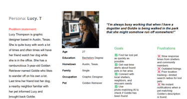 Lucy lives in pet-friendly apartment complex and often takes her dog Goldie for evening walks in the parks nearby after work. She is active in several online pet communities and occasionally volunteers at shelters. Because she works in social media she uses her own account to share pet adoption and lost and found pets on her posts. Sometimes when people reach out to her about their lost pets she feels that searching through other platforms across Facebook, Craigslist, and other websites feel chaotic and time-consuming. A lot of times false sightings and dupe listing make it hard to focus on relevant leads.
